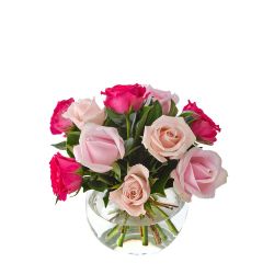 Arrangement of 10 Mixed Pink Roses in a Glass Fishbowl