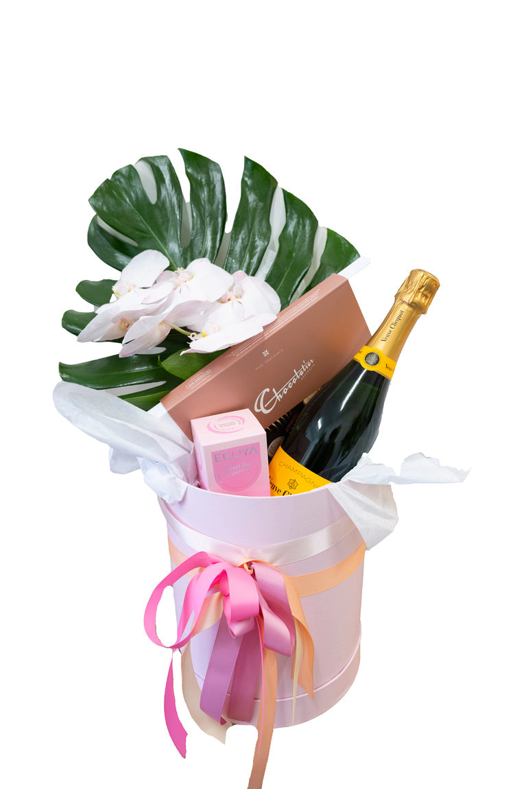 A beautifully designed gift box including a stunning Phalaenopsis orchid and gorgeous foliage: